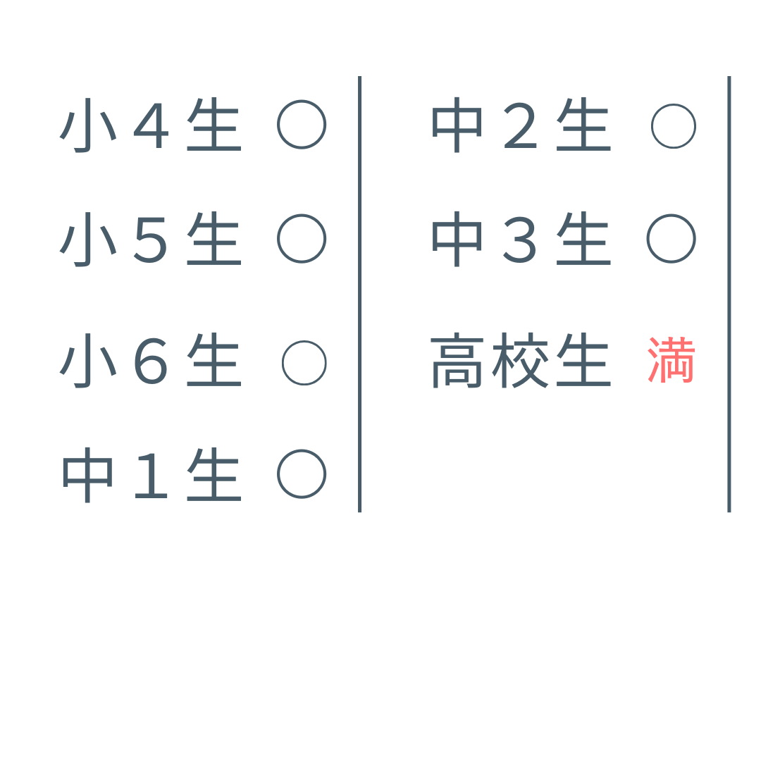 いつからでも入塾できます。年度の途中はもちろんのこと、月の途中からでも通塾を始めていただけます。 また、入塾可否のためのテストは一切行っておりません。現状の学力や目標に合わせて、ひとりひとりに最適な学習計画をご提案しますので、安心してご入塾いただけます。