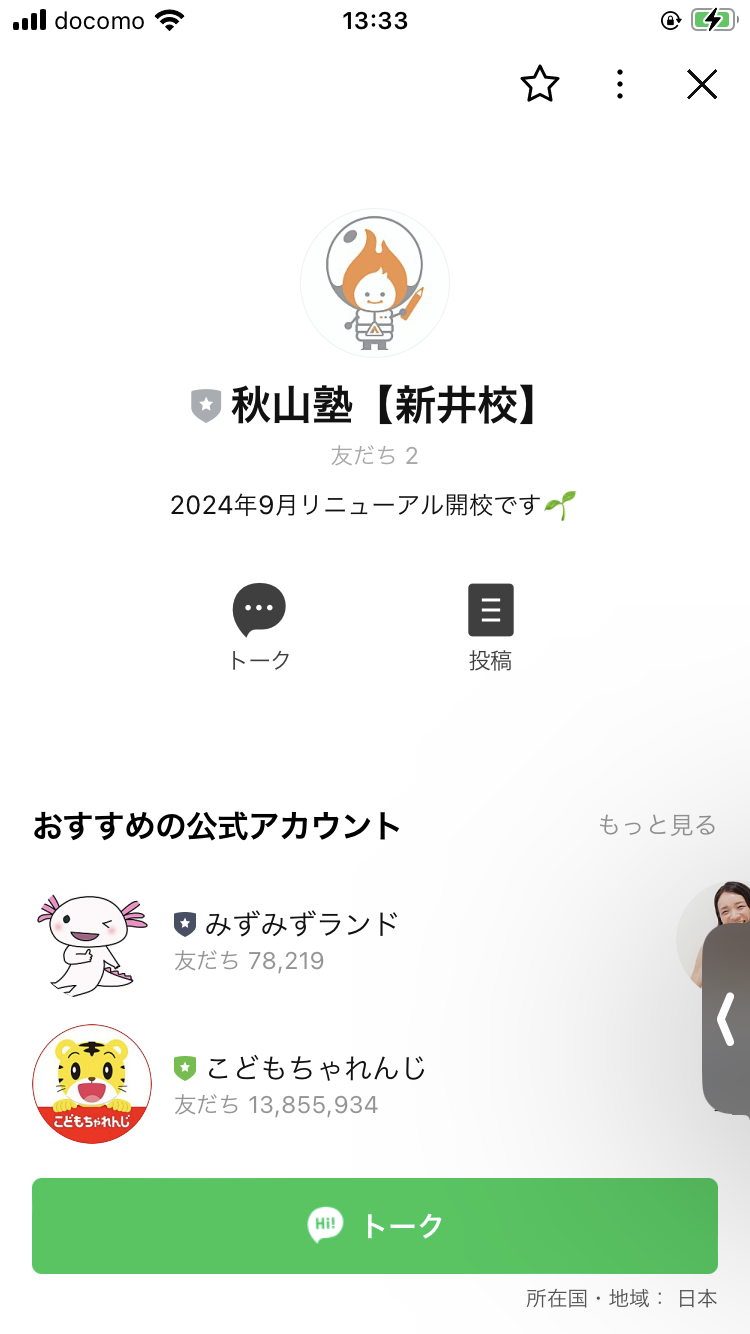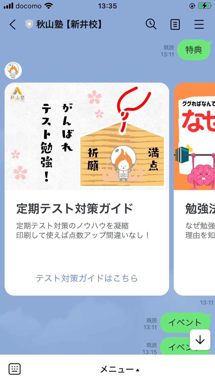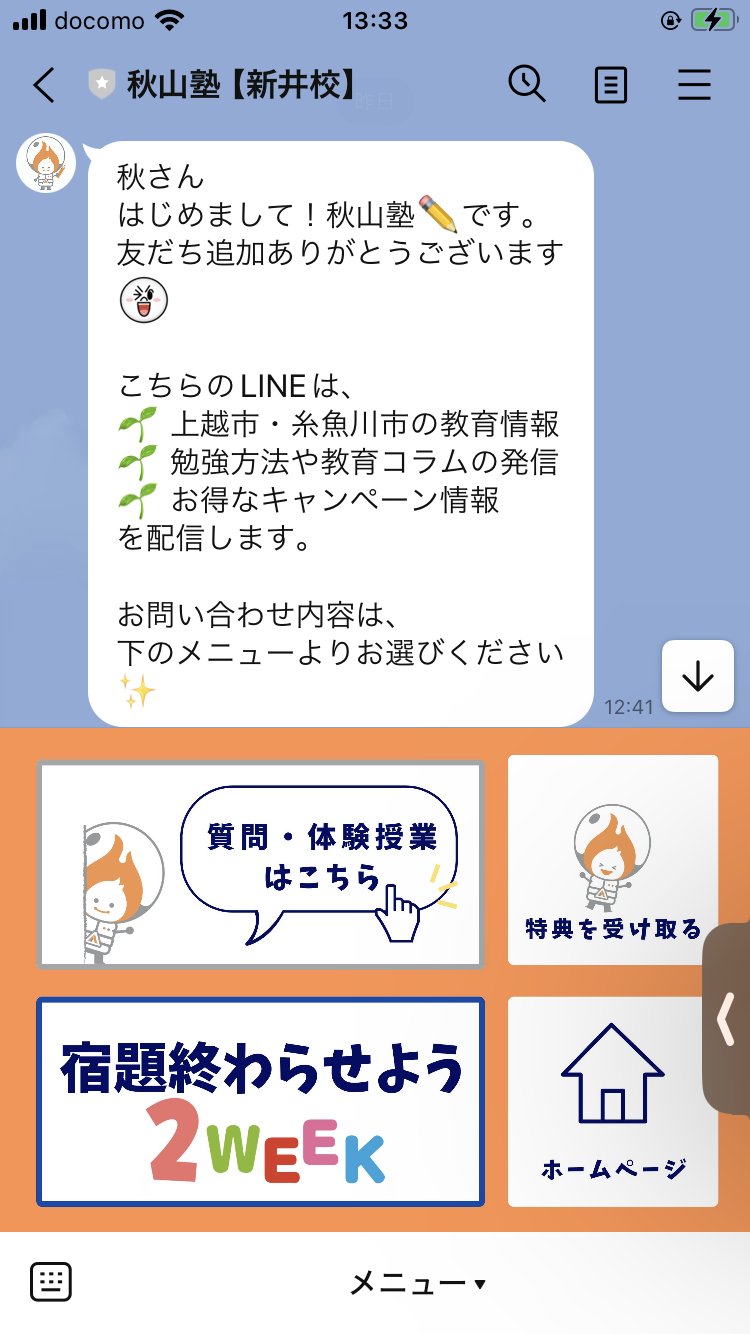 実際と同じ授業を 1 ヶ月間無料で受講していただけます。 教室の雰囲気や指導者の教え方、学習の流れなどを体験していただき、お子様にとって秋山塾が合っているかを ご検討いただける機会です。体験授業は LINE からお申込みいただけます。